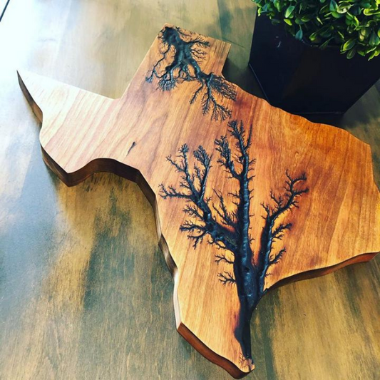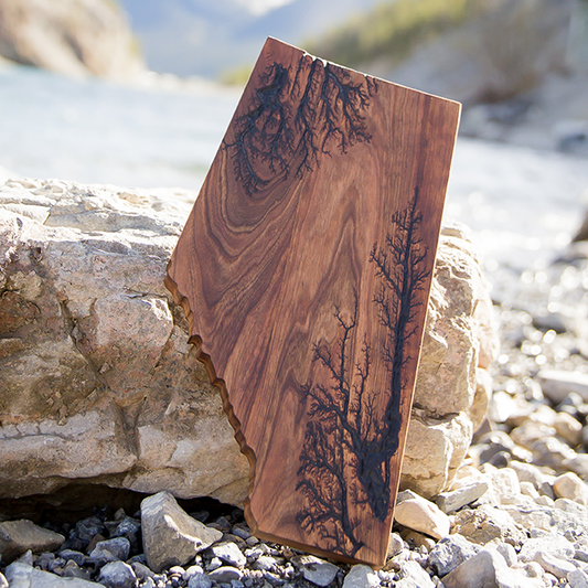Each piece in our collection is electrified with 10,000 volts of electricity leaving a stunning fractal pattern. No two boards are the same.